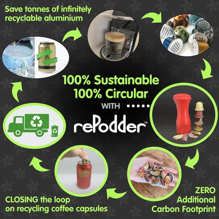 Using facts, figures and CAGR, we've crunched the numbers to estimate 77 Billion capsules will be produced in 2022. With Nespresso® officially publishing that less than 30% of their brand capsules are being returned globally (equating to 4.5 Billion, approx.), it means there are still a huge amount of coffee capsules ending up in our local landfills. rePodder is tackling this head-on and has developed a NEW alternate option to recycle coffee capsules at home.
